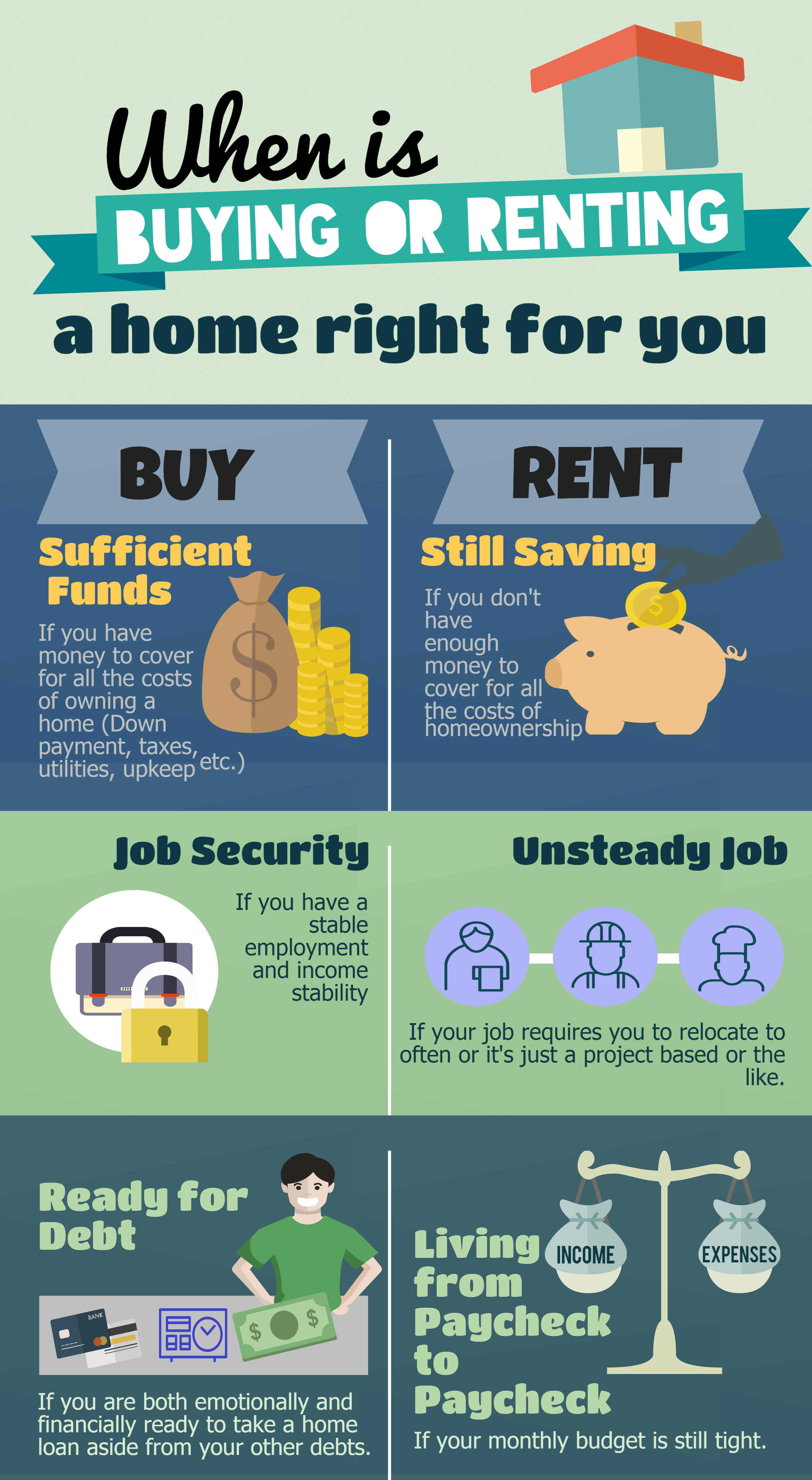 Should you buy or rent? It's a big decision and there are pros and cons to each option. Buying a home is one of the biggest financial purchases you will ever make in your life and it is only natural to carefully consider your situation before deciding whether to rent or buy a home.To answer the question, whether buying or renting a home is better for you, you have to look at your situation. Take a look at the infographic below: