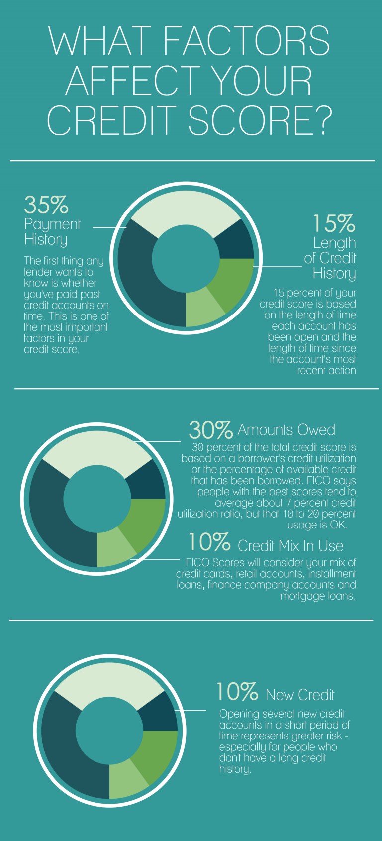 Opening new accounts rapidly will have a large effect on your score – not in a good way. If you’ve opened several accounts recently, you could be a greater credit risk. Research shows opening several new credit accounts in a short time period represents greater risk. People tend to open new accounts when they are experiencing cash flow problems or planning to take on new debts.